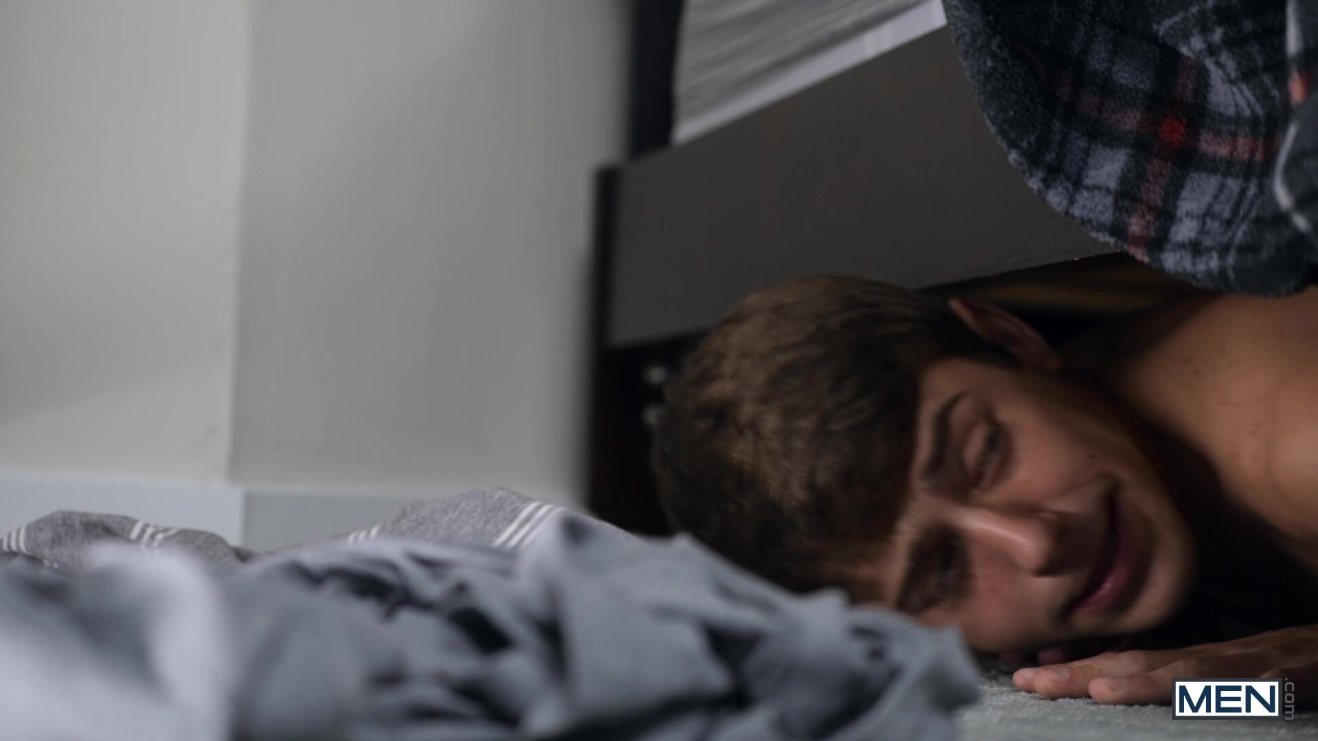Pervy Joey Mills is up to the usual--jacking off while sniffing his roommate's underwear--when he hears him coming back with his girlfriend! Joey hides under the bed and has to listen as Drake Von fucks Aria Valencia, but he gets a delightful surprise: the condom full of Drake's cum dropped right in front of his face for him to taste. When Drake catches Joey in the act, Joey cums clean, and Drake decides to let Joey taste it fresh! He fucks the twink's mouth, then pounds Joey's ass missionary as the bottom asks for more. The top flips him over onto all fours to rim his hole, then fucks him doggystyle while slapping his ass! Drake penetrates Joey in spoon before the bottom sits on his dick, riding his roomie till he orgasms, then begging for Drake's load.