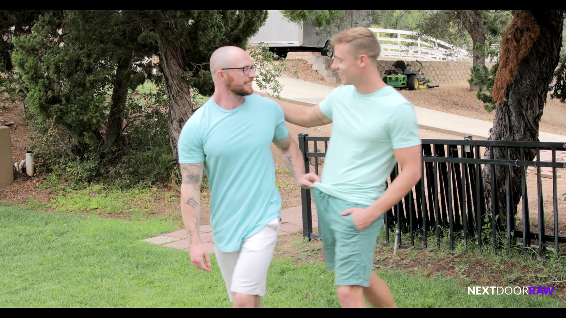 As he takes his turn to pitch, Justin Matthews can feel Markie More eyeing him up and down, and when he scores a sudden ringer, he effectively buries Markie's chances for a comeback, so there's no reason they shouldn't stop and just go fool around. Justin gives in and Markie leads them over to a cabana where he shows Justin what he means, deep throating Justin's dick and sucking on his hole as he tongue fucks Justin's sweet ass. Justin moans and agrees that Markie is much better at this game, but when Markie plunges his rock hard cock deep into Justin's bare hole, he realizes Markie might just be the best. Markie fucks him on the cabana as Justin strokes himself hard, and when he's had his fill, Markie lets Justin have his turn, mounting him and riding him until Justin is ready to spit his load. He pulls out and shoots all over Markie's hole as Markie cums all over his chest. He bends down to kiss and Justin concedes that Markie is much better at horsing around than he is at horse shoes.